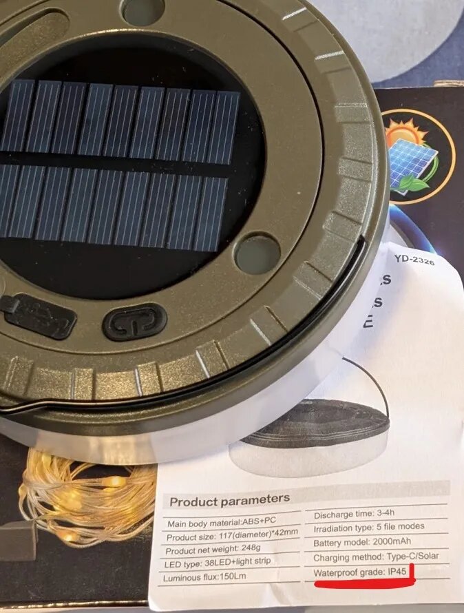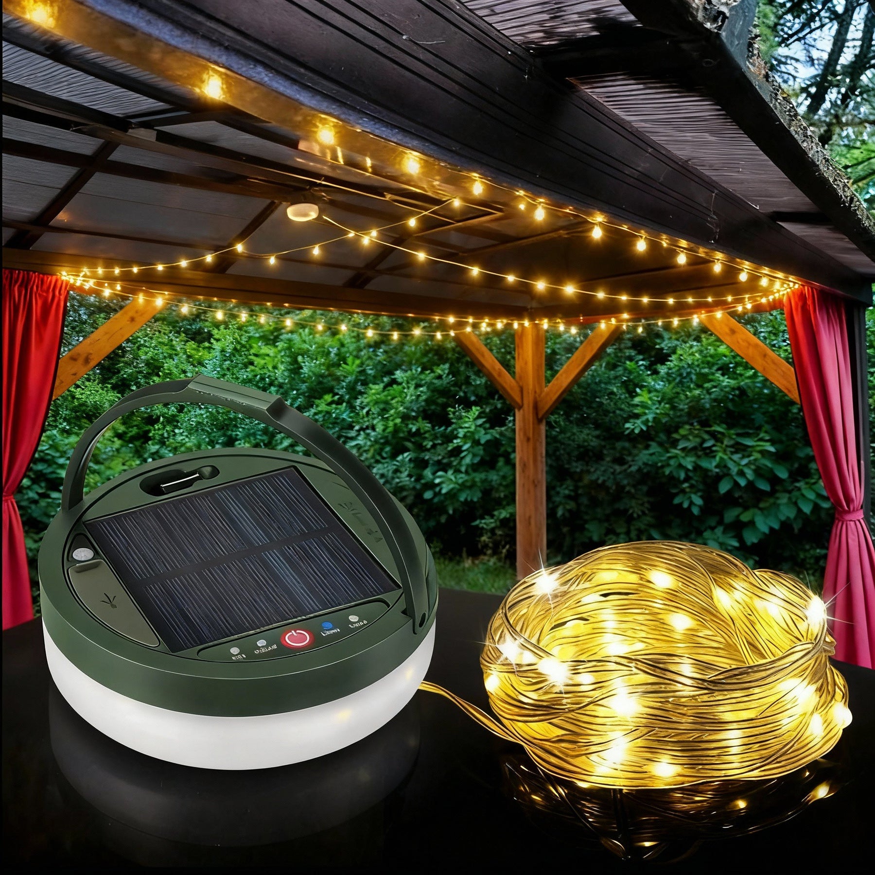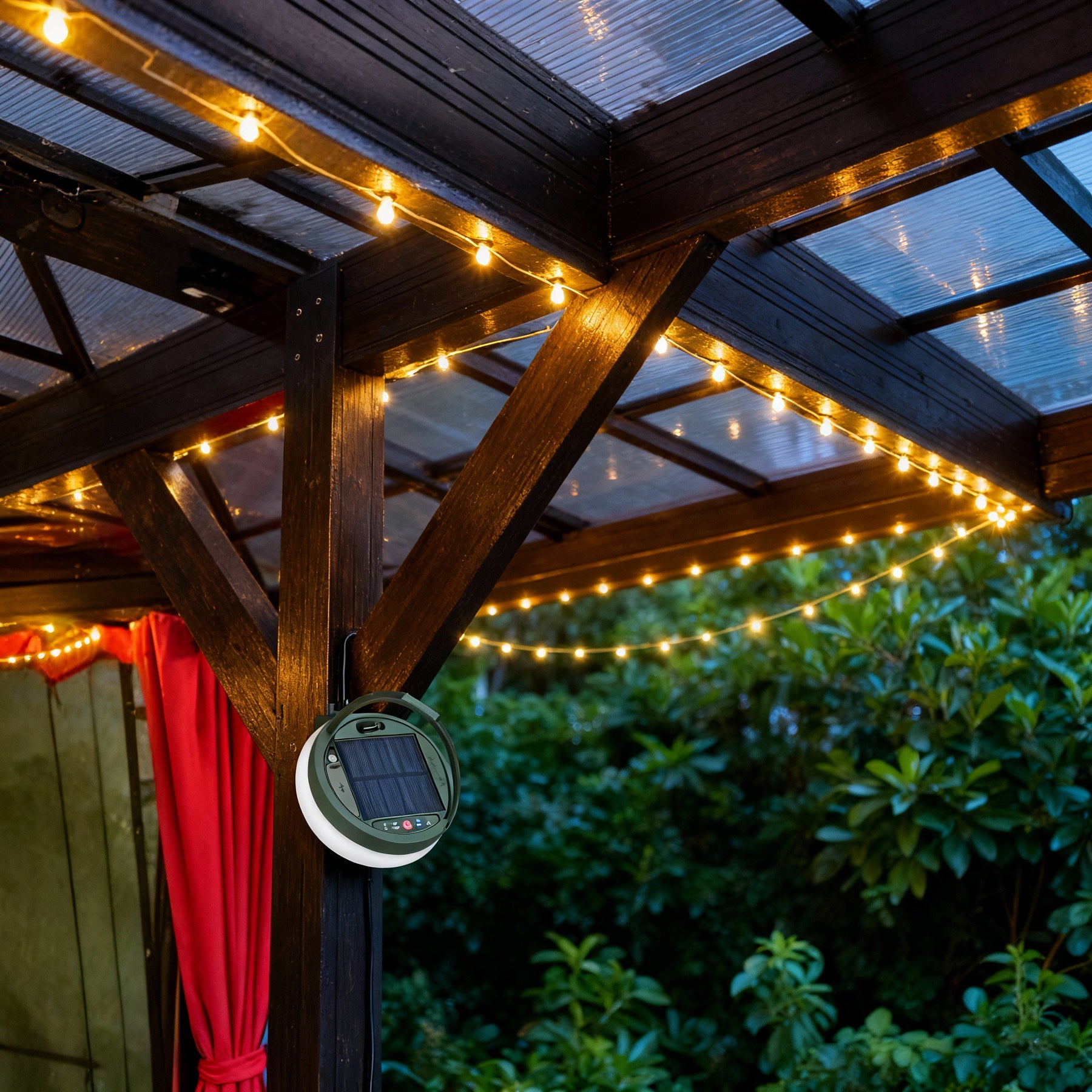 Waterproof solar lantern with colourful LED string lights, perfect for outdoor adventures. Built to handle rain and damp conditions with IP44 and IP65 waterproof ratings. Compact, portable, warm ambient lighting powered by solar energy.