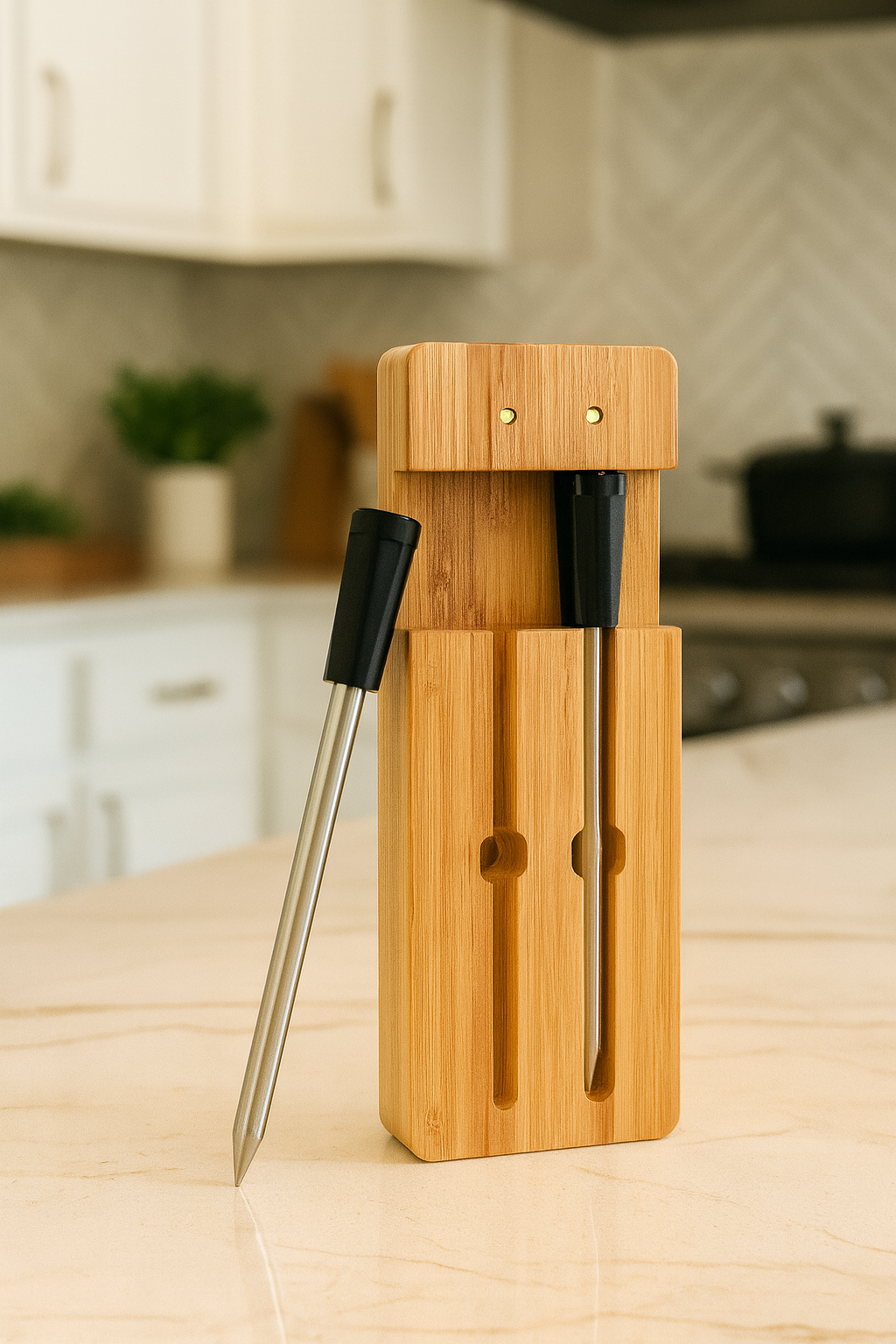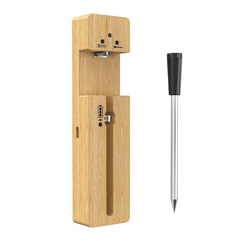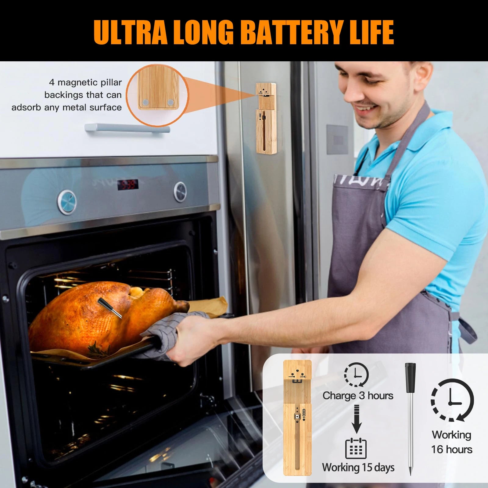 This smart wireless thermometer delivers fast, accurate temperature readings, helping you cook every dish to perfection without guesswork. Its sleek bamboo charging base keeps your kitchen organized while the probe ensures consistent results, whether you're grilling, roasting, or meal prepping.