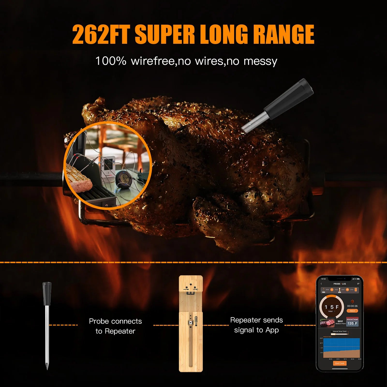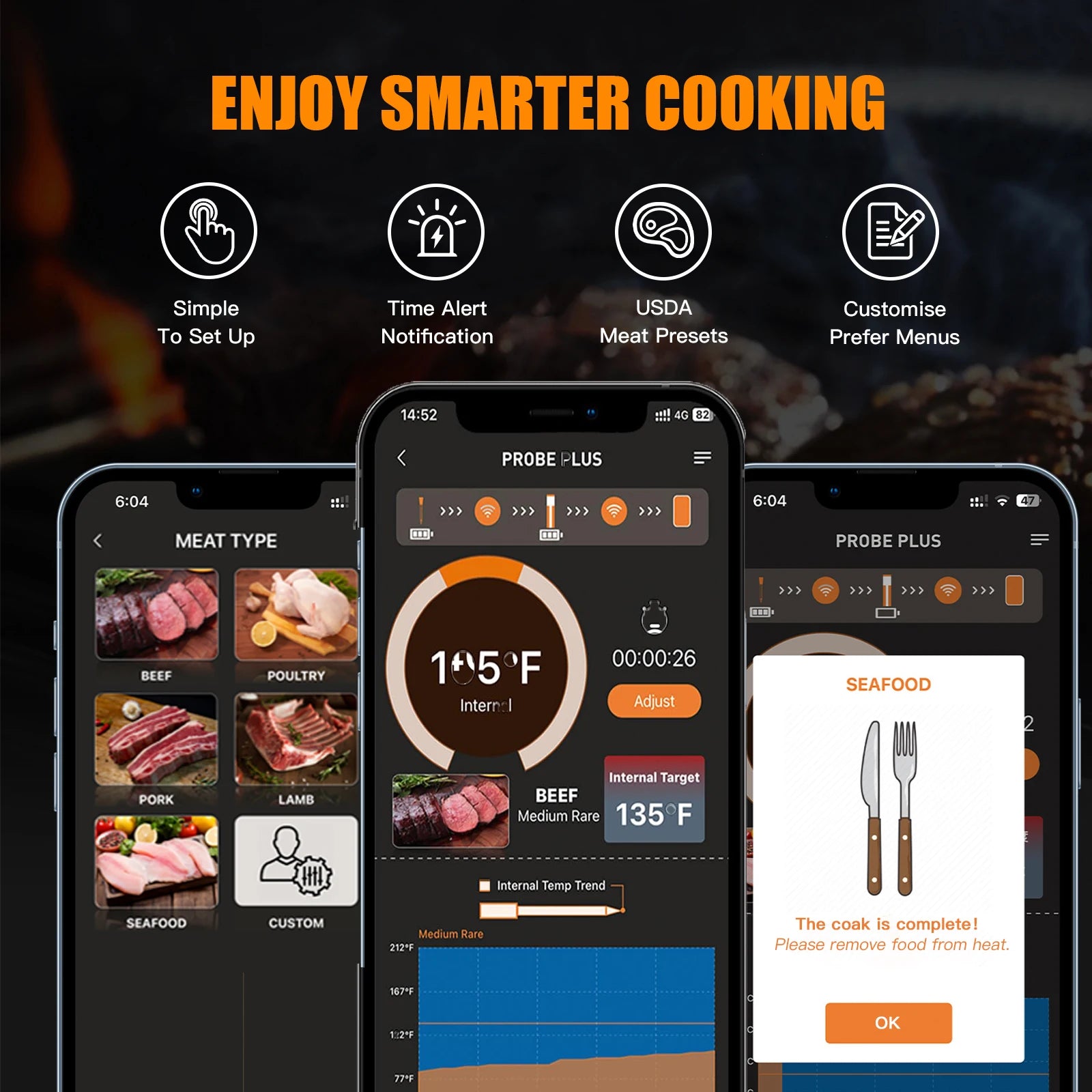 The probe measures the internal temperature of your food and sends real-time readings to your phone, so you can cook without checking constantly.
